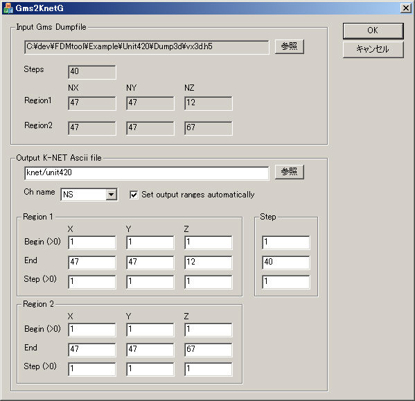 - [Region1], [Region2]ではK-NET Asciiファイルとして出力する領域を開始・終了・ステップ(格子単位)で指定します。